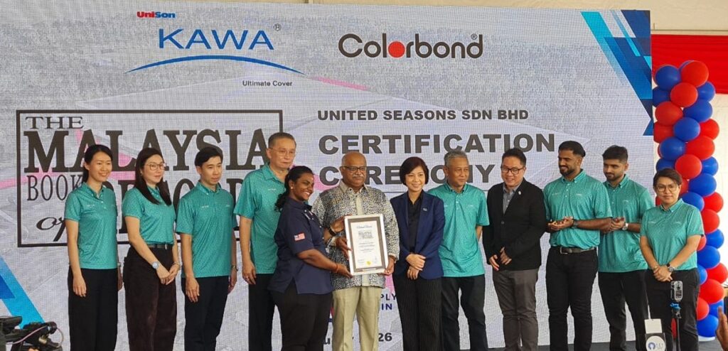 KUALA LUMPUR – United Seasons Sdn Bhd (UniSon), peneraju utama penyelesaian bumbung logam dan pelapisan dinding total di Malaysia, secara rasmi diiktiraf oleh Malaysia Book of Records kerana berjaya menghasilkan Lembaran Bumbung Terpanjang, iaitu 166.49 meter, yang dipasang di YLL Supply Chain Hub, kemudahan logistik dan rantaian bekalan berteknologi tinggi di Rawang, Selangor.